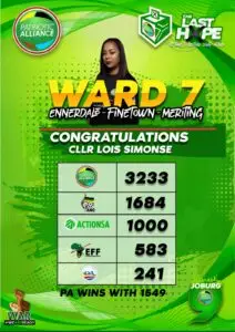 By: ANG Reporter The Patriotic Alliance (PA) has thanked the residents of Ennerdale, Finetown and Meriting in Ward 7 in the City of Johannesburg (CoJ)