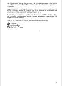 Former City of Johannesburg Executive Mayor Mpho Phalatse has resigned as a DA councillor in the City of Johannesburg.