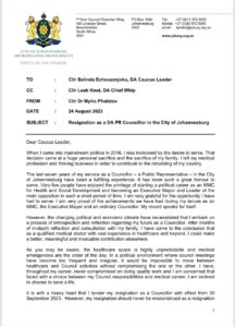 Phalatse, a qualified medical doctor who became mayor of the City after 2021 local government elections but lost her position after a motion of no-confidence against her succeeded in January, said in her resignation letter that after introspection, she had decided to return to being a medical profession.