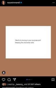 Nazanin told People magazine in March that they had to work to keep the fire in their relationship going during the quarantine and were successful. “We were used to being around each other a lot, but then we were also used to travelling a lot. So keeping the spark alive was something we had to stay on because when you’re in different cities, it’s automatic to feel excitement (when you see each other again). But being home together all the time, it’s like we have to find new things to watch, do, and read. It was a lot, but overall we did great. I have no complaints and am grateful for everything.”